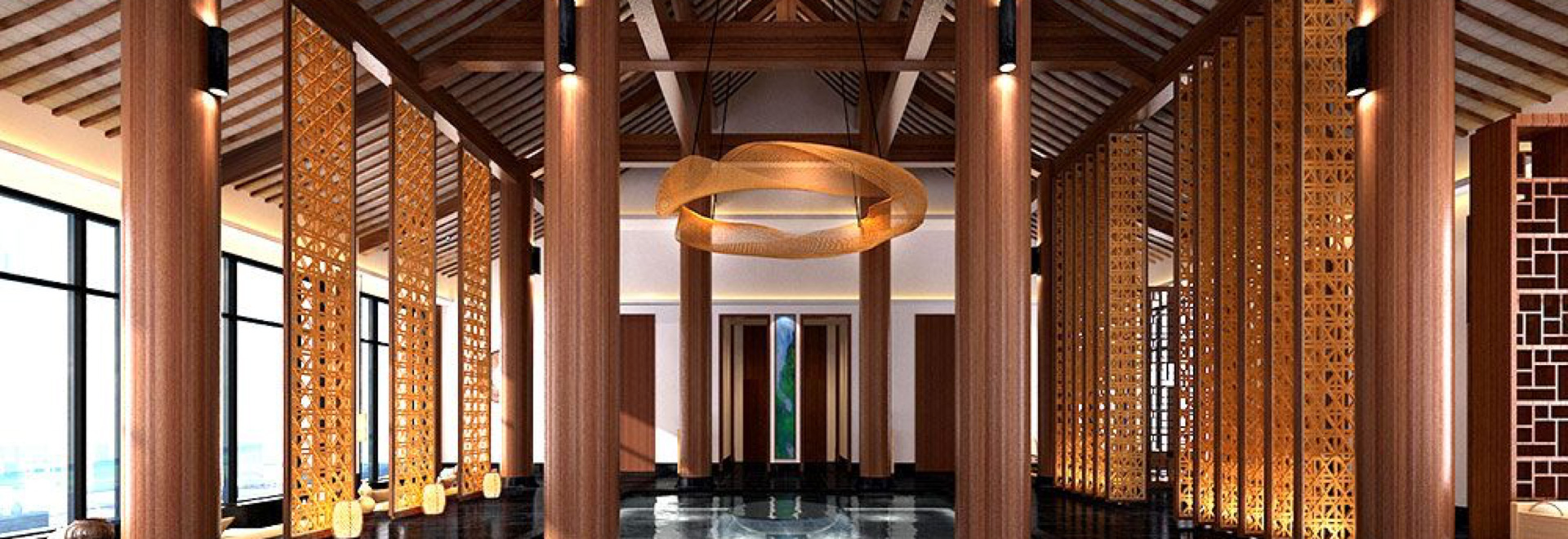 柔和光線背景下的幾何藝術圖案衍生成超級逃逸和空靈的畫面形象,激發更深層次的冥想。天花裝飾采用竹裝飾板手工編織,體現了展館的自然精神和終極美學。